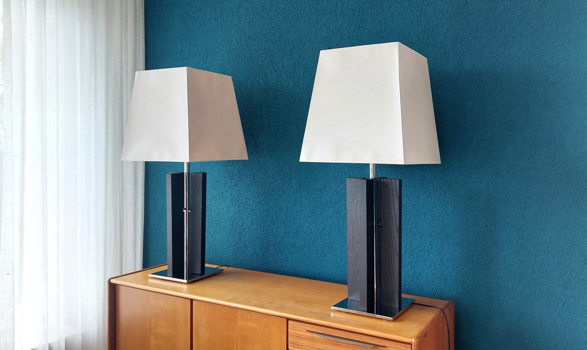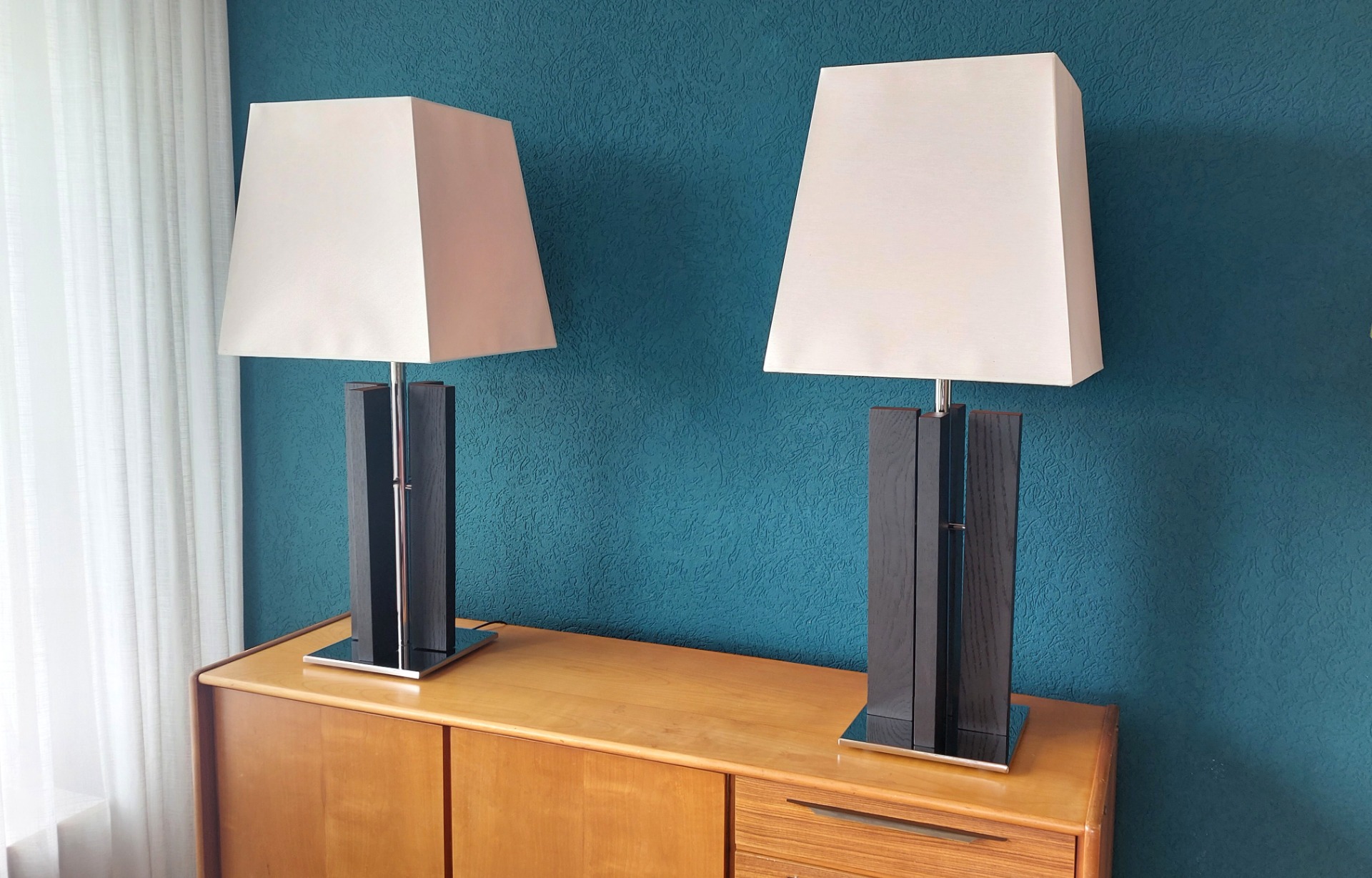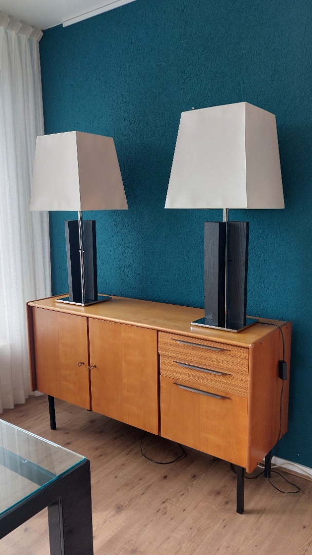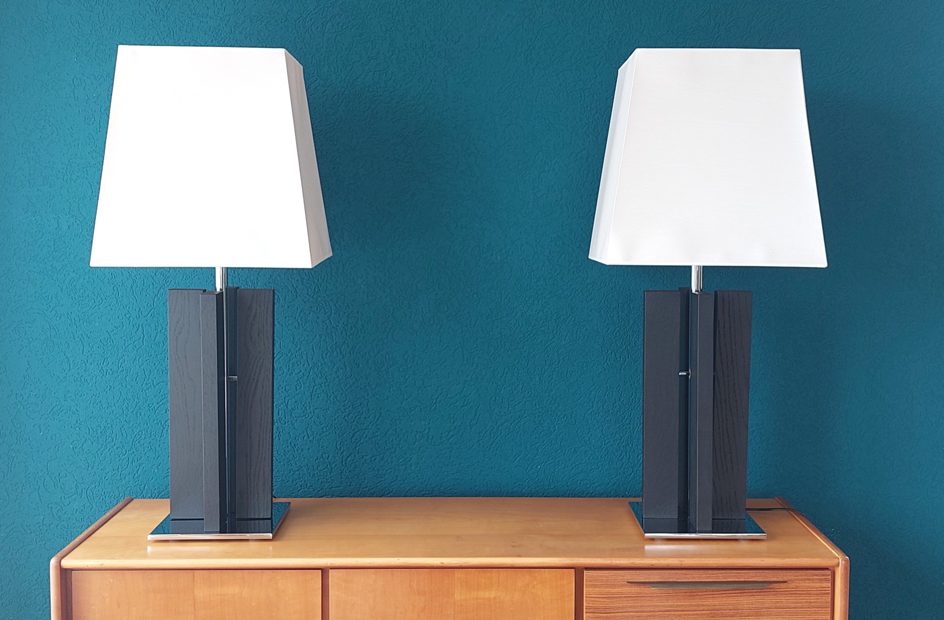 Condition: The lamps are in very good condition, with only minor signs of wear on the chrome or wood.